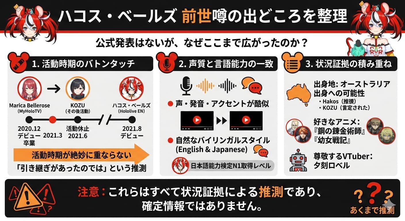 タイミングを見ると、KOZUさんの活動休止から約2ヶ月後の2021年8月に、ハコス・ベールズさんがホロライブENとしてデビューしています。この「活動時期のバトンが渡されたような流れ」が、前世特定の噂の大きな発端になったと考えられます。