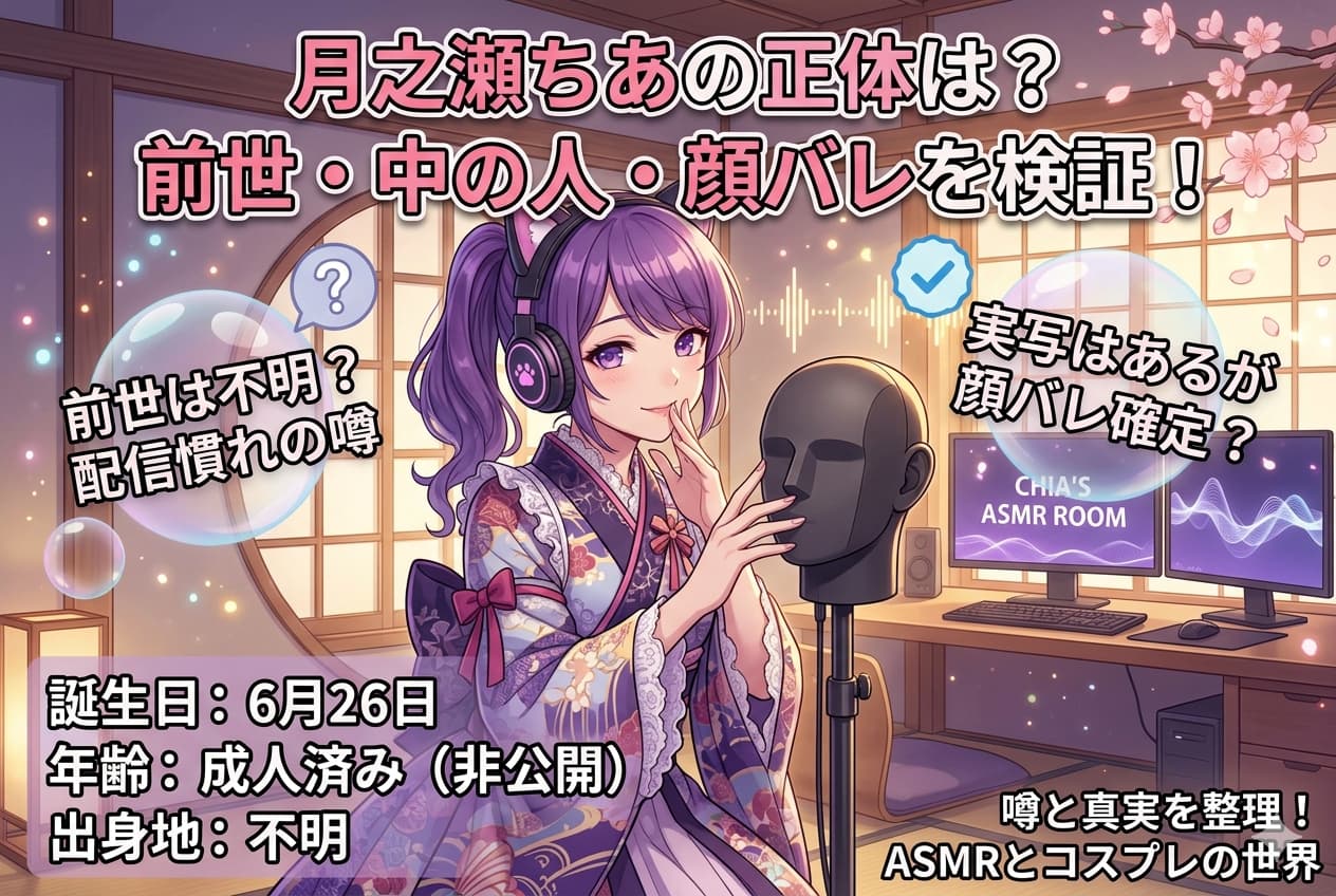 月之瀬ちあさんの前世・中の人・顔バレ・年齢については、はっきりした確定情報は多くありません。誕生日は6月26日、少なくとも成人済みという点までは追えますが、それ以上を断定的に語るのは難しい、というのが今回の結論です。だからこそ、必要以上に正体探しへ寄りすぎず、ASMRの音作りやコスプレを含めた世界観そのものを楽しむのが、いちばん気持ちよく応援できる見方だと私は思います。